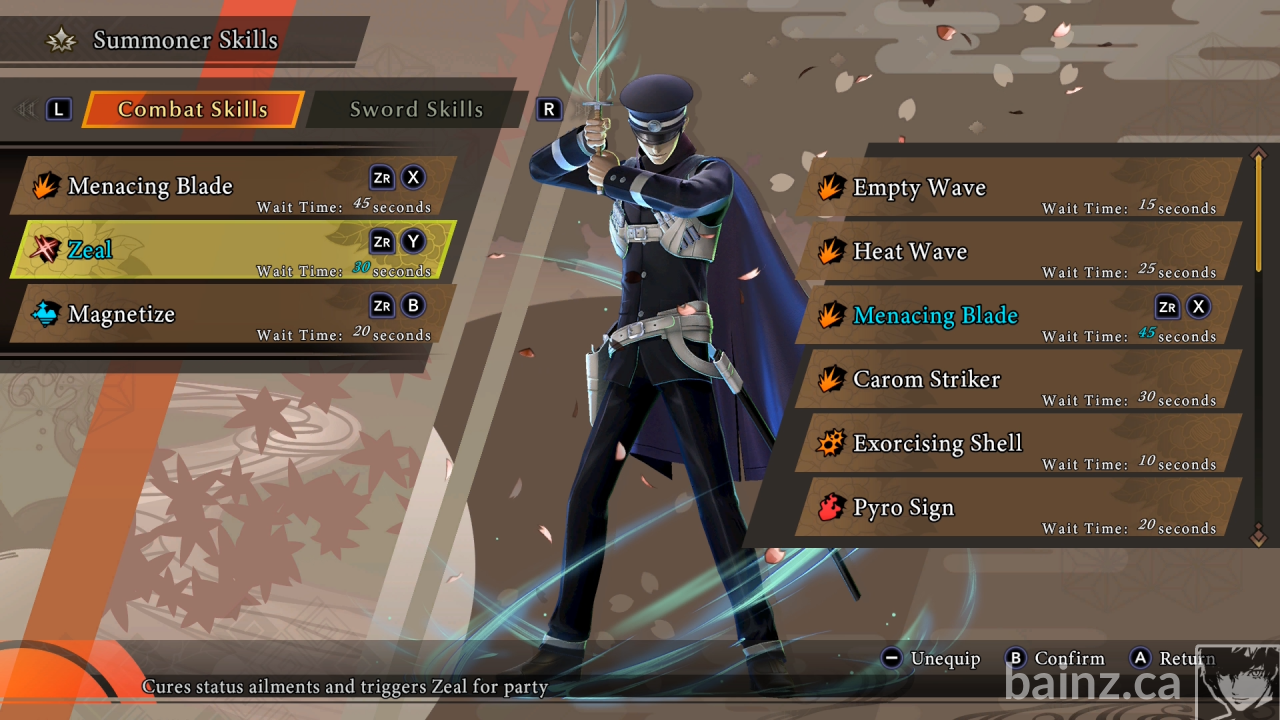 Next are the 3 skills you can use in combat. There are a number of them in the game, but I actually stuck to 2 early ones for my entire playthrough. The first one being Magnetize from the Type-32 Gunto Axe, which restores 50% of your MAG. Because of how important MAG is for your Demon allies, this skill never left my build. The second one was Zeal from the Kiyotsune Axe, which cures your team’s status ailments and triggers ‘Zeal’ for the party. The effect of Zeal seems to provide a status immunity, and increase your team’s offense and defense during its 10 second duration. It has a longer cooldown of 30 seconds, but it’s the only team boosting skill Raidou gets, so I kept it my entire playthrough.