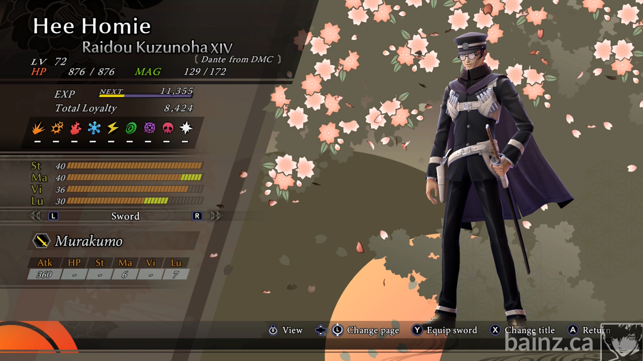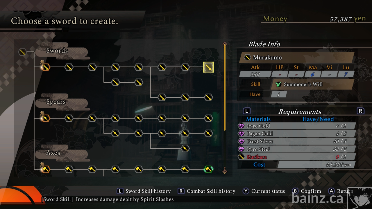 The main way to actually customize Raidou is through Sword Alchemy in the Goumaden. You can unlock more weapons for Raidou as the story progresses, in the form of swords, spears and axes. Swords offer standard balanced gameplay, spears are faster and good for the Combo Meter, while axes are slower but do more damage per hit. I found swords to be the most comfortable, so by late game, I stuck with a sword called Murakumo. But any weapon works, as long as they have the same base attack and bonus stats.