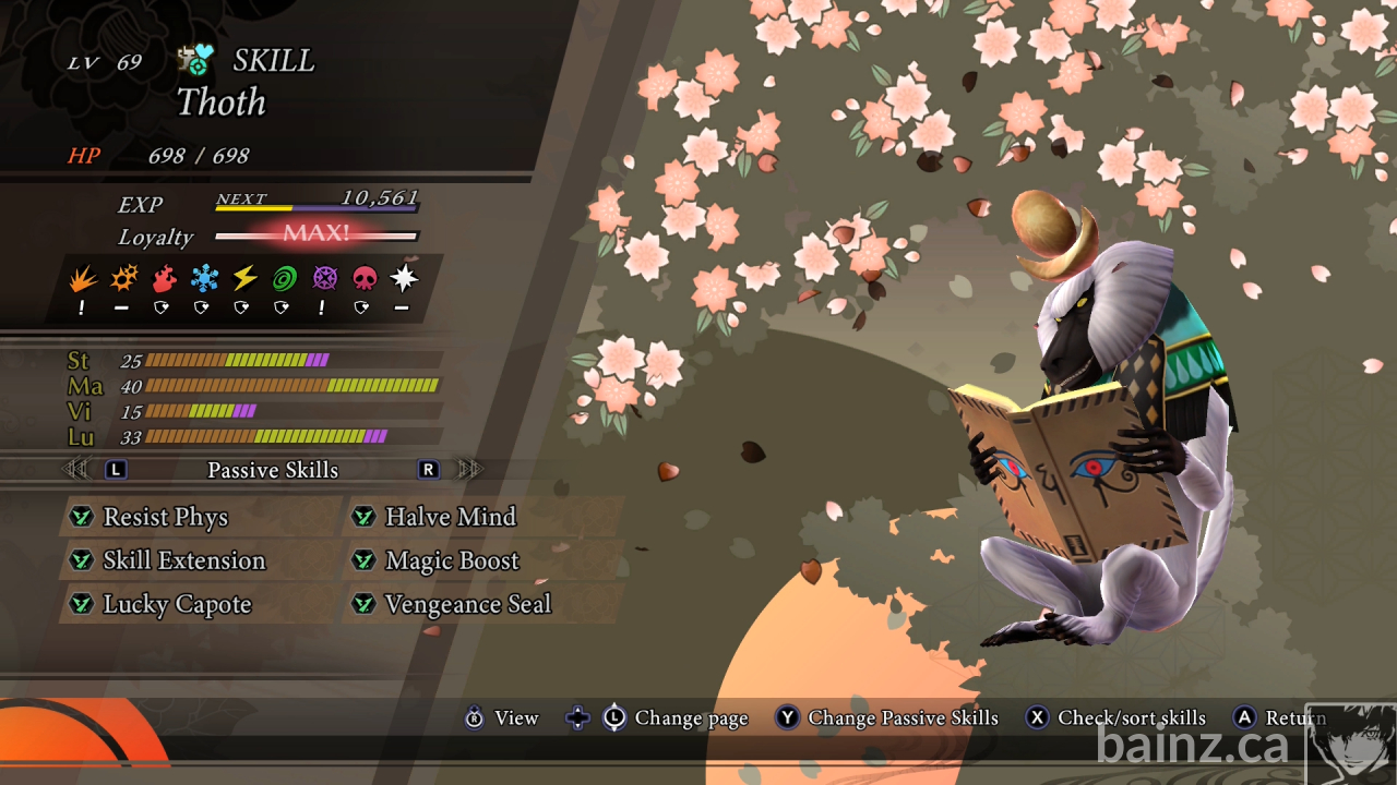 Something else I wanted to include in this post were the main Demons I ended up using. Every Demon skill in Raidou is transferable, meaning there isn’t much separating Demons gameplay wise, in fact only their base resistances offer much reason to use one over another. The Demon that actually has the best resistances is Thoth, a Level 38 Demon that has better resistances than even Level 70 ones. 5 immunities at Level 38 is insane, and they come at a time when you can get Resist Phys easily from Hayatoro. I made this Demon into my main buffer and healer, they were given all the temporary duration buffs. The passive Skill Extension increases the duration of buffs cast and Magic Boost reduces MAG consumption.