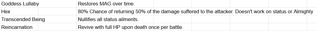 - Capricious Miracle: Provides a chance that Demon attacks do not consume MAG
